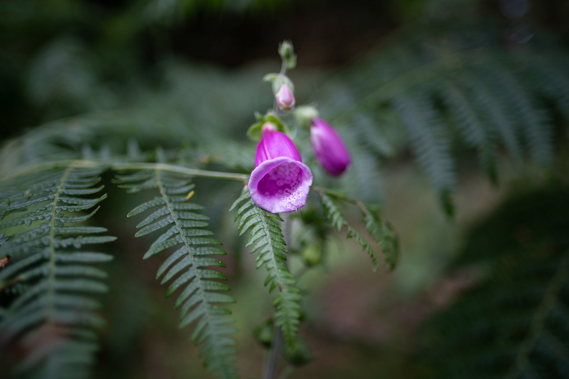 Photograph of foxgloves with rain droplets and a dreamy effect.